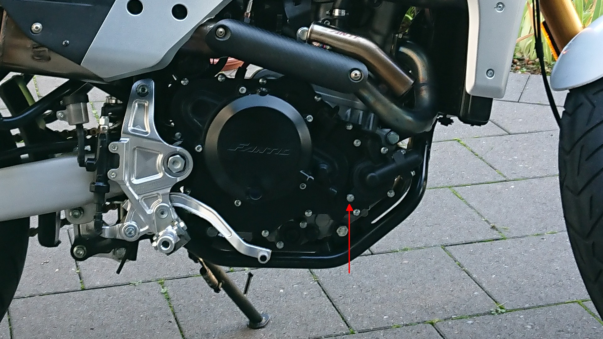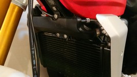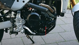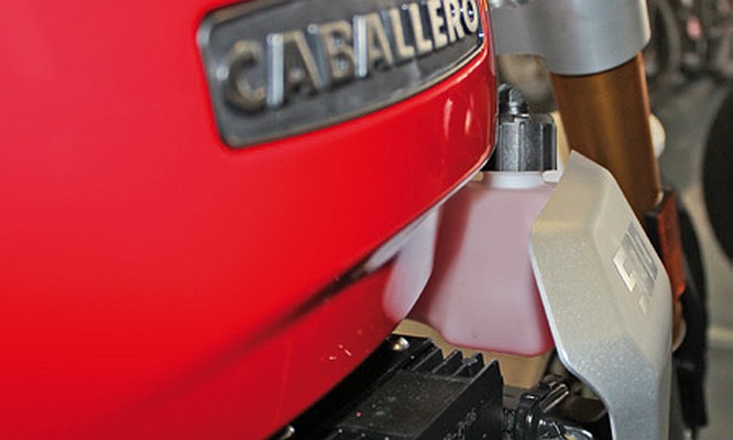 Der Ausgleichsbehälter für die Kühlflüssigkeit hat mir von Anfang an nicht gefallen. Weil er zwecks Füllstandkontrolle leicht transparent ist, färbt sich der eigentlich weiße Behälter schweinchenrosa. Die rote Kühlerflüssigkeit scheint so stark durch. Passt überhaupt nicht, finde ich. Ich habe den Behälter abgebaut, mit Silikon-Entferner gereinigt und mit Sprühfolie, die eigentlich für Autofelgen ist, schwarz foliert. Wenn die Sprühfolie die Belastung an Felgen aushält, dann wird es dort auch halten. Zur Füllstandkontrolle habe ich rechts auf der Rückseite einen kleinen Streifen nicht foliert.