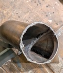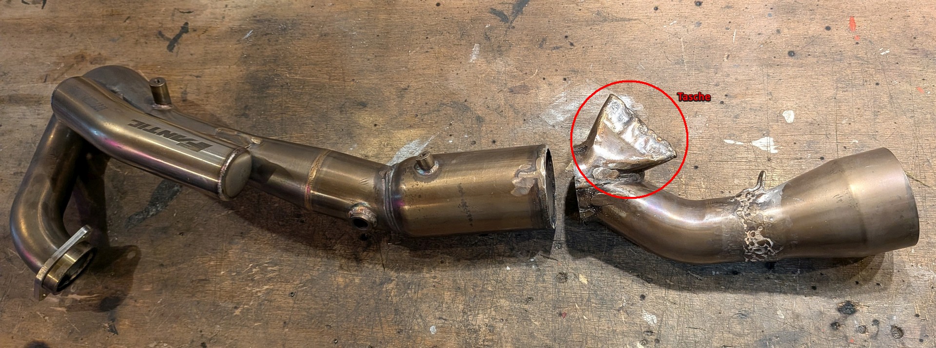 ![]() Weil ich denke, mein Selbstbau-Krümmer ist der Verursacher des Knallens und der schlechten Performance, habe ich den zersägt. Die Reduzierung auf nur ein schmaleres Rohr hinter dem Katalysator anstatt zwei wird wohl etwas Leistung kosten. Und meine sehr grobschlächtige Art, das zweite Rohr des Y-Adapters einfach durch zusammenquetschen zu schließen, sorgt bestimmt für Verwirbelungen und weiteren Leistungsverlust. "Auspuff-Verwirbelungen, oft als lautes Blubbern, Knallen oder Bollern wahrgenommen, entstehen durch gezielte Strömungsmanipulation (Sportauspuff) oder ungewollt durch Probleme wie lose Teile oder defekte Dichtungen, was den Abgasfluss stört und Leistungsverlust, erhöhten Verbrauch oder sogar Schäden verursachen kann." Mit dieser "Tasche" direkt hinter dem Kat habe ich wohl so eine Verwirbelung erzeugt.