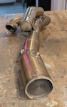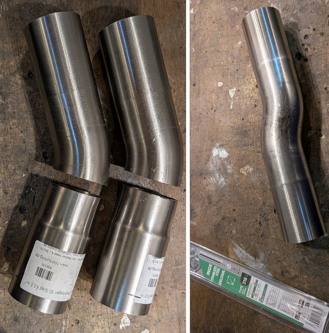 Aber lange konnte ich das nicht liegen lassen. Ich habe zwei Edelstahl Auspuff Rohrbögen 30 Grad 63,5 mm mit Muffe bestellt, zersägt und verdreht zusammen geschweißt, um den Höhenunterschied zwischen KAT und Schalldämpfer zu überbrücken. Die Aufnahme des Rohrs am Schalldämpfer sollte laut MIVV Unterlagen 65 mm sein, war aber 65,5 mm. Ein 65 mm Rohr saß locker und wäre undicht, die Muffen der Edelstahl Rohrbögen (außen 66,5 mm) waren zu groß. Ich habe dann eine der Muffen abgesägt, geschlitzt und dann verschweißt. An der Seite zum KAT musste ich den Rohrbogen etwas schräg anschweißen, damit ich den Schalldämpfer mit dem Krümmer ohne Verspannung treffe.