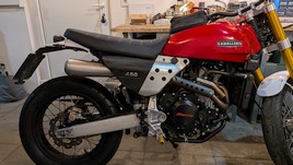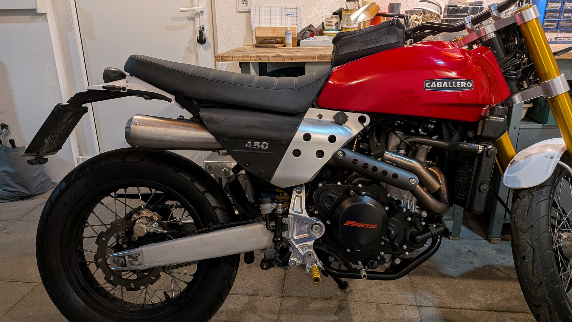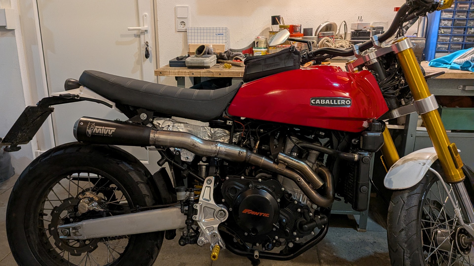 Vor einiger Zeit habe ich auf der Website The Deus Fuoristrada eine umgebaute Caballero Rally mit einem interessanten Auspuff gesehen. Der originale Doppelrohr Schalldämpfer wurde durch einen einfachen von SC-Project ersetzt. Fand ich sehr gut, die Idee. Der voluminöse 1-in-2 Auspuff gefällt mir nicht so gut, ist wahnsinnig schwer und sorgt dafür, dass die Caballero etwas zu breit in den Hüften geraten ist. Ich habe bereits an den Halterungen am Auspuff und am rechten Seitendeckel rumgebastelt, um das etwas schmaler zu bekommen. Aber ein anderer Auspuff mit nur einem Endrohr, das wäre natürlich die Lösung.