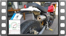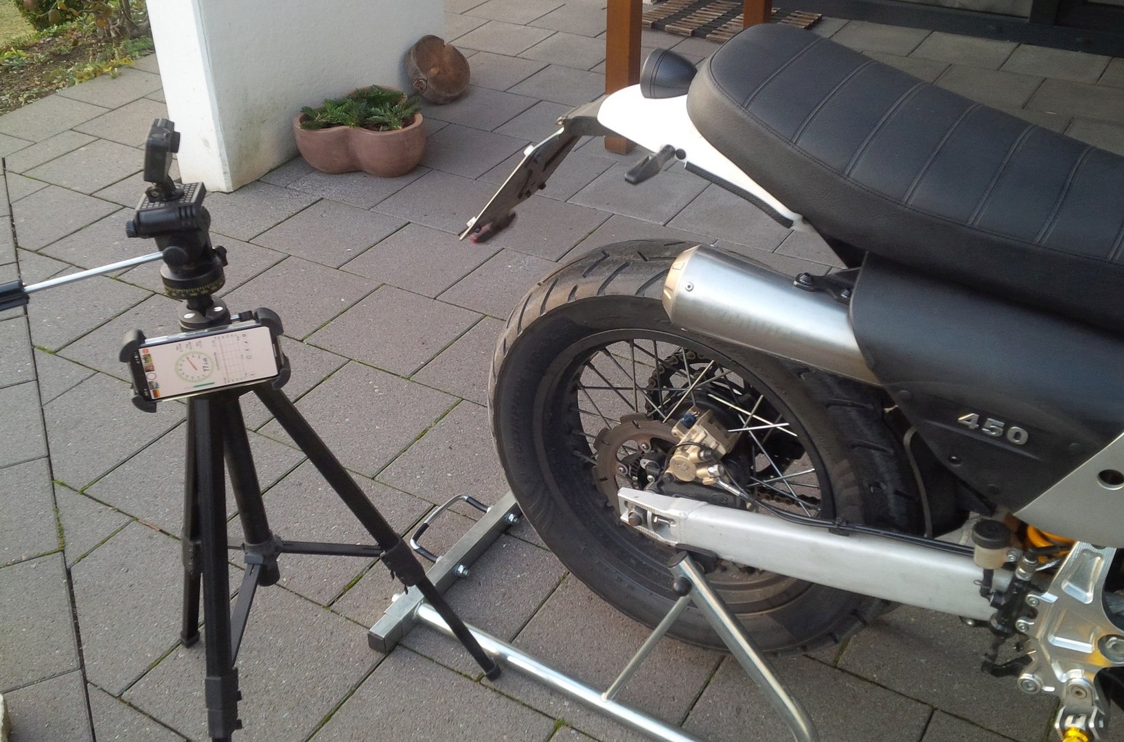 ![]() Ich hatte bereits vorab eine Schallmessung mit dem originalen Schalldämpfer gemacht. Natürlich habe ich kein geeichtes Messgerät, wie es die Polizei verwendet. Aber beim Messaufbau habe ich mich an die amtlichen Vorgaben gehalten: Das Mikrofon in Höhe der Auspuffmündung. Die Mikrofonkapsel gegen die Ausströmöffnung der Abgase, in einem Winkel von 45 Grad und in einer Entfernung von 0,5 Meter. Die in der Zulassungsbescheinigung angegebene Drehzahl von 3.750 rpm (± 5 %) einstellen. Wenn ich das genauso mit dem MIVV Schalldämpfer messe, kann ich zumindest vergleichen, ob der neue Auspuff lauter oder leiser ist. Große Überraschung bei der neuen Messung: Das Motorrad ist ein bis zwei dB LEISER! Gefühlt hätte ich behauptet, es ist etwas lauter. Aber der Klang ist einfach nur anders, etwas aggressiver. Ich mache erst mal nichts am DB-Eater und warte ab, wie sich das Motorrad fährt. Bei der ersten Testfahrt hatte ich den Eindruck, dass der Motor im mittleren Drehzahlbereich kräftiger geworden ist, dafür aber etwas schlechter ausdreht. Die im Fahrzeugschein angegebene Höchstgeschwindigkeit von 139 km/h wird immer noch locker erreicht, aber dann geht es nicht so flott weiter wie mit dem originalen Auspuff. Es scheint, dass das fehlende zweite Rohr die Maschine etwas drosselt. Beim Viertakter ist der Staudruck des Auspuffs für die Maximalleistung eher störend, anders als beim Zweitakter, wo der sogar benötigt wird. Beim Viertakter gilt grob gesagt: Je offener und je lauter, umso mehr Leistung. Aber egal, ich fahre meist nur auf Landstraßen und fast nie auf Autobahnen. Da ist der Durchzug sowieso viel wichtiger als die Höchstgeschwindigkeit. Außerdem ist mir die nochmals stärkere Hitzeentwicklung unter dem Seitendeckel aufgefallen. Muss auch daran liegen, dass nun alle Abgase durch ein Rohr strömen anstatt zwei. Dazu habe ich nun zusätzlich zu der Hitzeschutzfolie an Batteriekasten und Seitendeckel noch Hitzeschutzband an der Stelle um den Krümmer gewickelt.