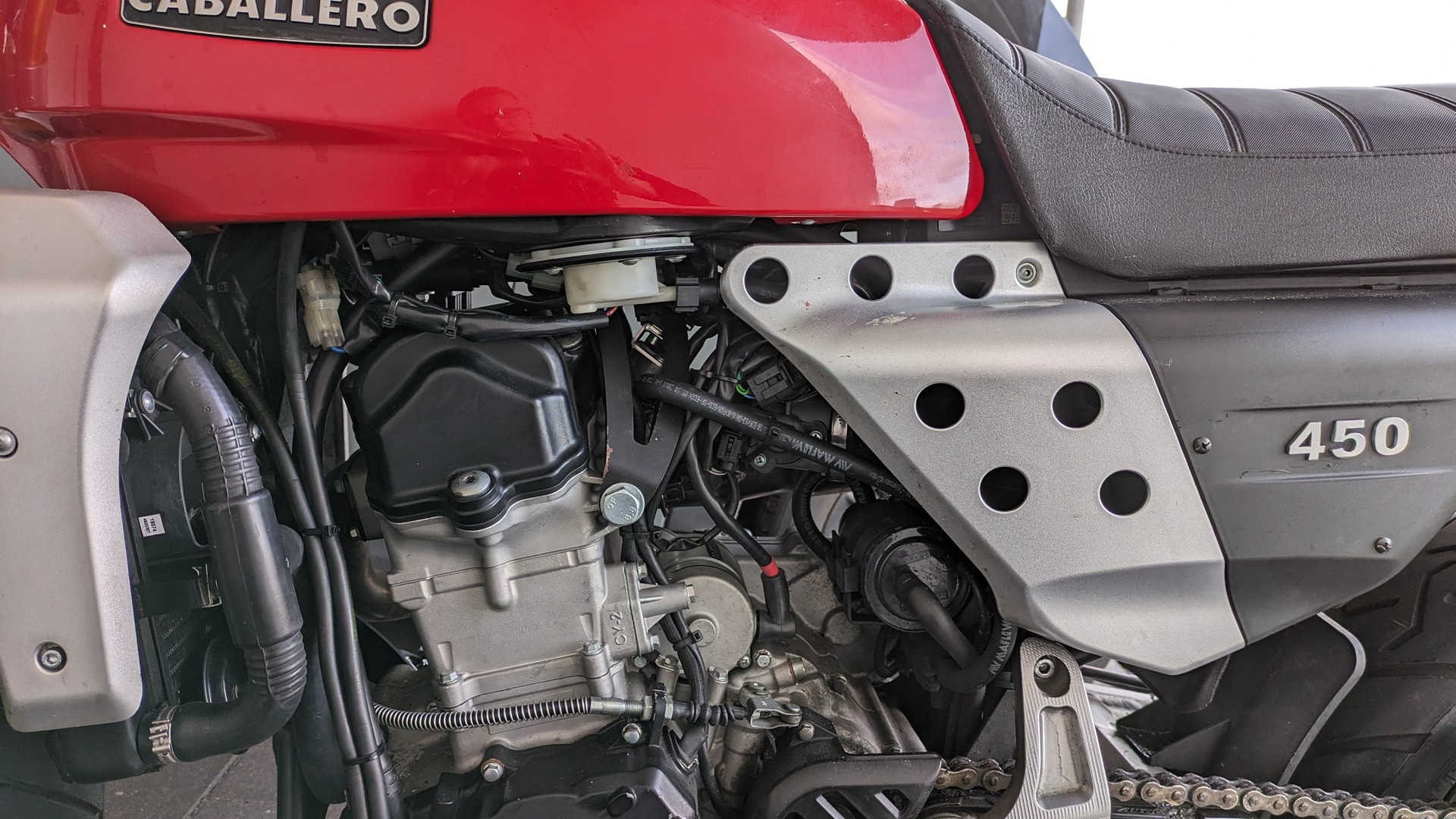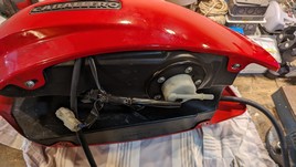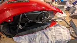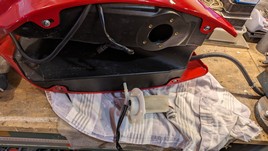 Ich habe meine Benzinpumpe lackiert! Klingt erst mal unglaublich blöd. Aber irgendwann hatte ich auf Ebay einen französischen Privatanbieter entdeckt, der eine 3D-gedruckte Blende für das weiße Plastikteil unterm Tank angeboten hat. Und dann ging mir das nicht mehr aus dem Kopf. Fast so schlimm, wie der Ausgleichsbehälter über dem Kühler. OK, der war sogar schweinchenrosa, wegen der Kühlerflüssigkeit. Aber das ist das gleiche Plastik, sieht doch blöd aus.