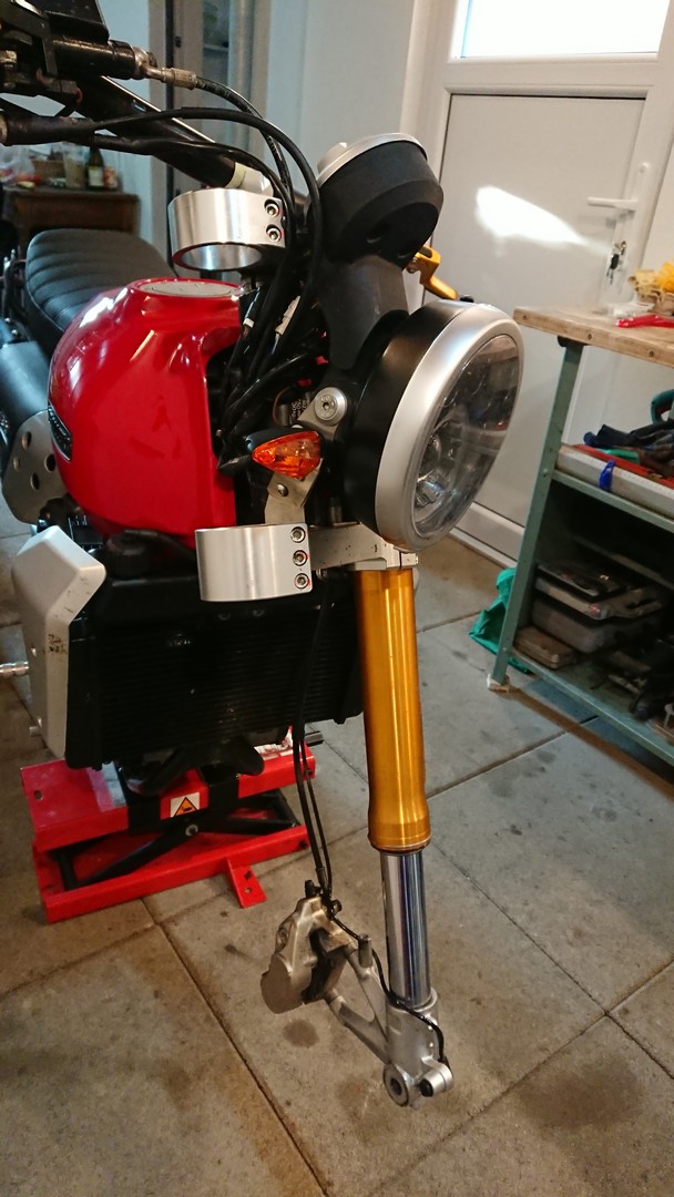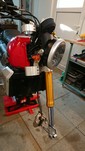Bei meinen letzten Fahrten hatte ich den Eindruck, dass meine Vorderradgabel nicht mehr so weich anspricht. Das war schon mal besser dachte ich. Möglich, dass die Gabel verspannt ist. Ich bin zwar nicht gestürzt aber zum Beispiel bei einer Vollbremsung kann bei Motorrädern mit nur einer Scheibenbremse die einseitige Belastung der Gabel schon zu einer Verspannung führen. Außerdem sorgt auch die Konstruktion mit nur einer Feder im rechten Gabelholm und der Dämpfung im Linken für asymmetrische Kräfte, die auf die Gabel wirken. Also habe ich gestern die Klemmung der Achse rechts, die Achse und die Klemmungen der oberen Gabelbrücke gelöst. Außerdem zur Sicherheit die Bremszange. Die Halterungen des Schutzblechs sind alle aus Plastik, da muss man nichts lösen, ist alles flexibel. Dann das Motorrad vom Heber genommen und ein paar Mal mit Druck auf den Lenker eingefedert, ohne die Vorderradbremse zu betätigen. Dann alles wieder mit den entsprechenden Drehmomenten angezogen.