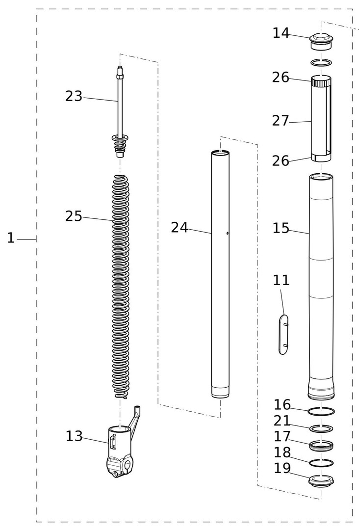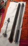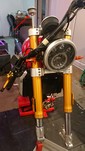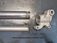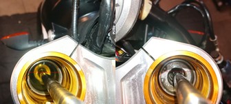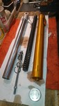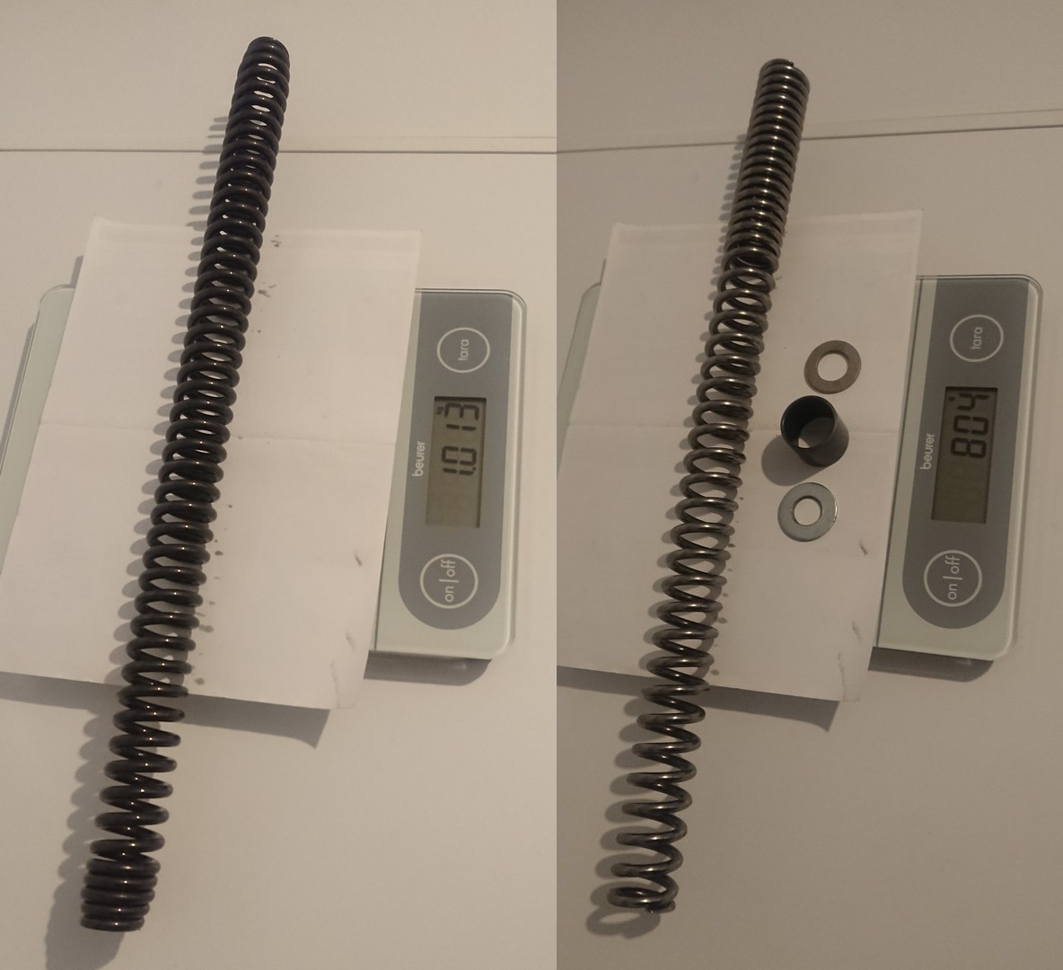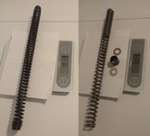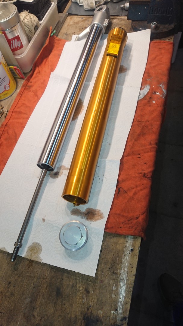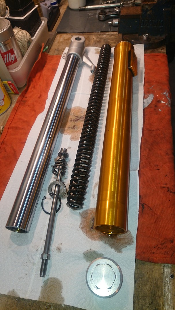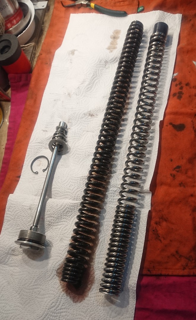 Die neuen Federn von "Wirth" sind da und heute hatte ich mal Zeit, die einzubauen. Eigentlich total easy, man muss nicht mal die Gabel zerlegen. Die Außenrohre können in den Gabelbrücken bleiben. Einfach nur Schutzblech ab, Bremszange ab, Vorderrad raus, Lenker ab. Dann kann man oben die Gabelstopfen herausdrehen und die Innenrohre hochschieben. Wenn man dann den Gabelstopfen abschraubt, kann man auf der rechten Seite das komplette Innenrohr samt Feder bzw. auf der linken Seite samt Dämpfer nach unten herausziehen.