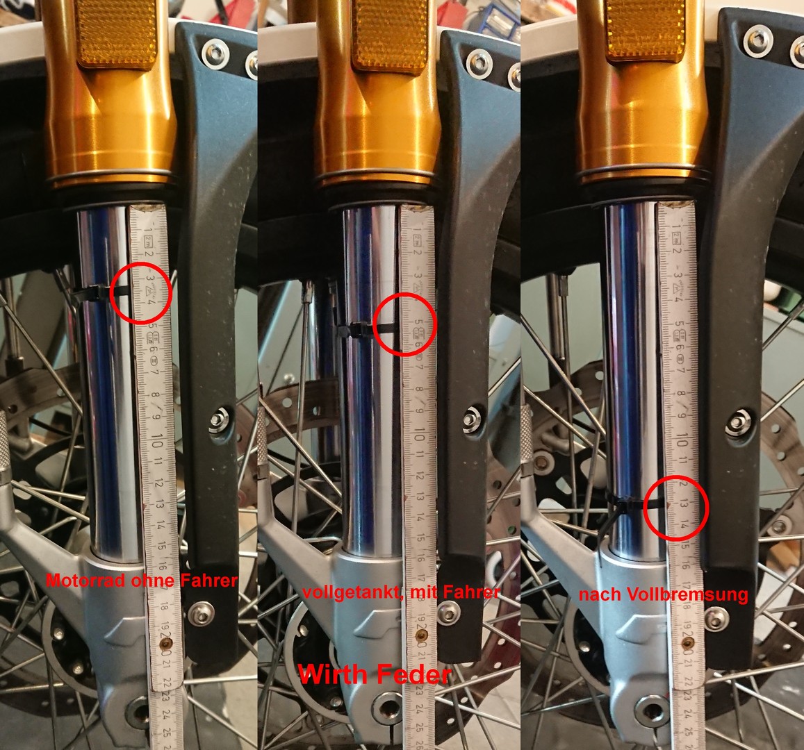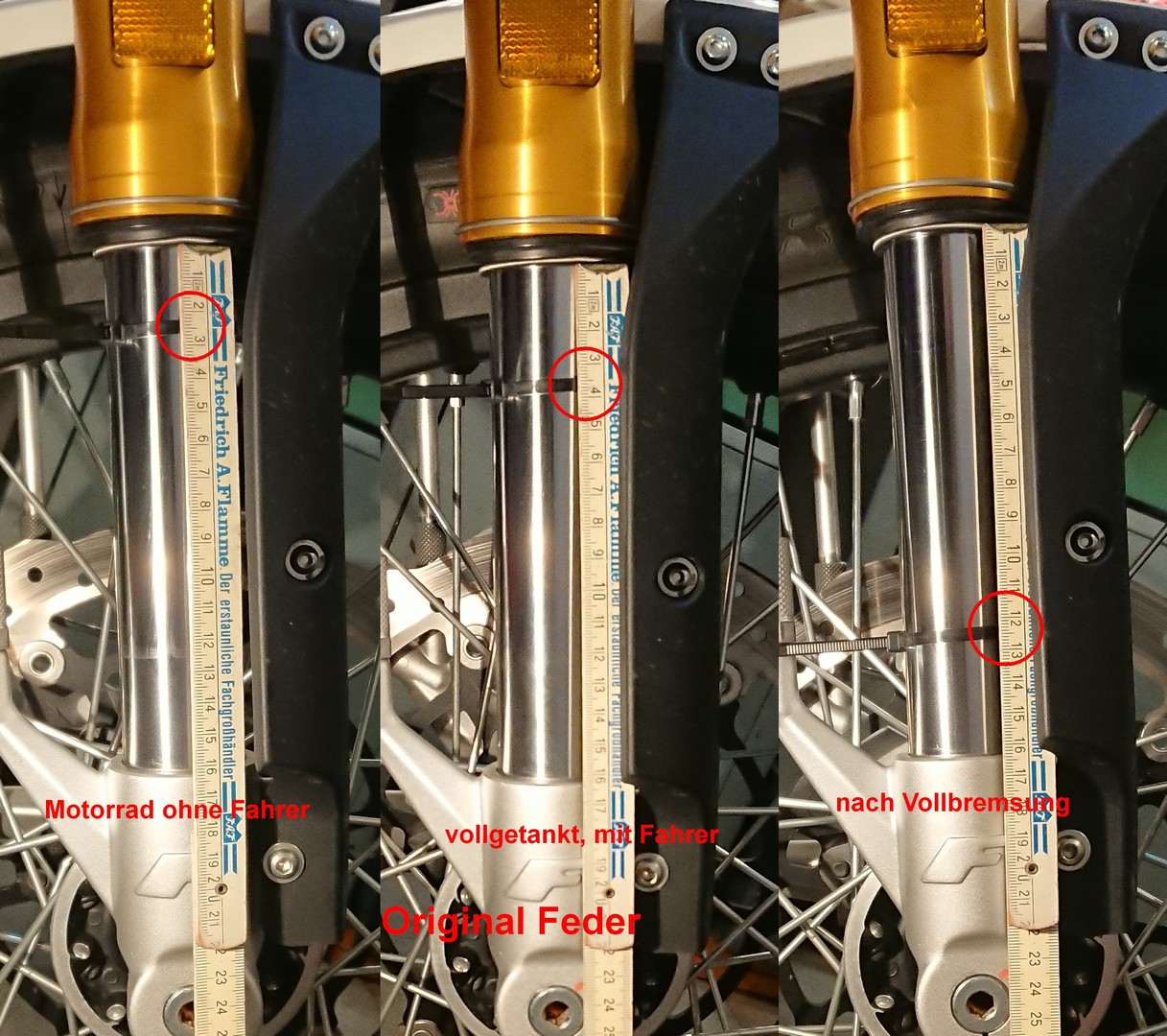![]() ![]() ![]() Aber Vorsicht beim Rausziehen. Wenn so ca. zwei Drittel des Innenrohrs raus sind, kommen zwei Löcher. Die sofort zuhalten, sonst schießt das Öl rechts und links raus. Ich habe natürlich beide Seiten abgebaut, um das Öl zu wechseln. Auf der linken Seite blieb die Dämpfereinheit aber zusammen. Ich habe die einfach nur umgedreht, um das Öl auslaufen zu lassen. Rechts muss man nur den Sprengring lösen und kann die Stange, die zwischen Gabelstopfen und Feder sitzt, herausnehmen. Ist nicht viel Druck drauf, geht relativ leicht. Habe ich ohne Hilfe hinbekommen, auch beim Zusammenbau ohne Federspanner. ![]() ![]() ![]() Die neue Feder passt perfekt, Länge stimmt und der Umfang ist auch exakt der Gleiche. Und 209 Gramm leichter ist die auch noch. Die Distanzhülse, die Wirth mitgeliefert hatte, kommt nach unten. Dann eine DIN 125 Unterlegscheibe M18, die ich besorgt habe, dann die neue Feder mit der progressiven engen Wicklung nach oben, dann eine Unterlegscheibe in den Maßen 11 x 34 x 3 (DIN 440/ISO 7094?), die Wirth mitgeliefert hatte. Die musste ich noch auf 16 mm aufbohren, damit der Bolzen der Stange reinpasst, die vom Gabelstopfen kommt. Um auch die Dämpfung in Zug- und Druckstufe an die weichere Feder anzupassen, habe ich 10er anstatt 15er Gabelöl eingefüllt. Zuerst habe ich wieder nur 380 ml (ca. 10 % weniger) in beide Holme getan. Damit war die Gabel aber zu weich. Das Luftpolster über dem Öl, das beim Einfedern komprimiert wird, war zu groß, die Gabel tauchte zu tief ein. Ich habe dann in beiden Holmen ca. 50 ml nachgefüllt, bis der Ölstand in beiden Holmen gleich war. Bei komplett eingefederter Gabel ungefähr 55 mm unterhalb der Oberkante. Damit war es gut und ich habe dann wieder gemessen, wie weit die Gabel bei verschiedenen Belastungen eintaucht. ![]() ![]() Das Motorrad ohne Fahrer ließ die Gabel 32 mm eintauchen. Mit Fahrer drauf tauchte die Gabel 50 mm ein. Die Vollbremsung aus 100 km/h ließ die Gabel 130 mm einfedern. Also noch 20 mm Luft bis zum Anschlag. Für mein Empfinden perfekte Werte. Und wie fährt Sie damit? Hammer. Einfach viel viel besser. Die Gabel spricht nun super feinfühlig an, federt weich und angenehm, ohne dass sich das Motorrad schwammig anfühlt. Der Umbau hat sich voll gelohnt. PS: 03.08.2024. Ein Leser dieser Seite, der eine 125er Deluxe Euro 5 besitzt, war ebenfalls unzufrieden mit der viel zu harten Feder in der Vorderradgabel. Aufgrund gleichen Aussehens und identischer Maße der Gabel wie bei der 500er hat er ebenfalls versucht, einfach die Feder zu tauschen. Leider hat das nicht geklappt. Die Gabel aller 125er Euro 4 und Euro 5 Modelle ist anders aufgebaut, im Inneren ist alles verpresst. Der rechte Gabelholm mit der Feder kann laut Ersatzteilliste nur als Ganzes getauscht werden. ![]() ![]() Vorderradgabel entspannt (17.10.2025)