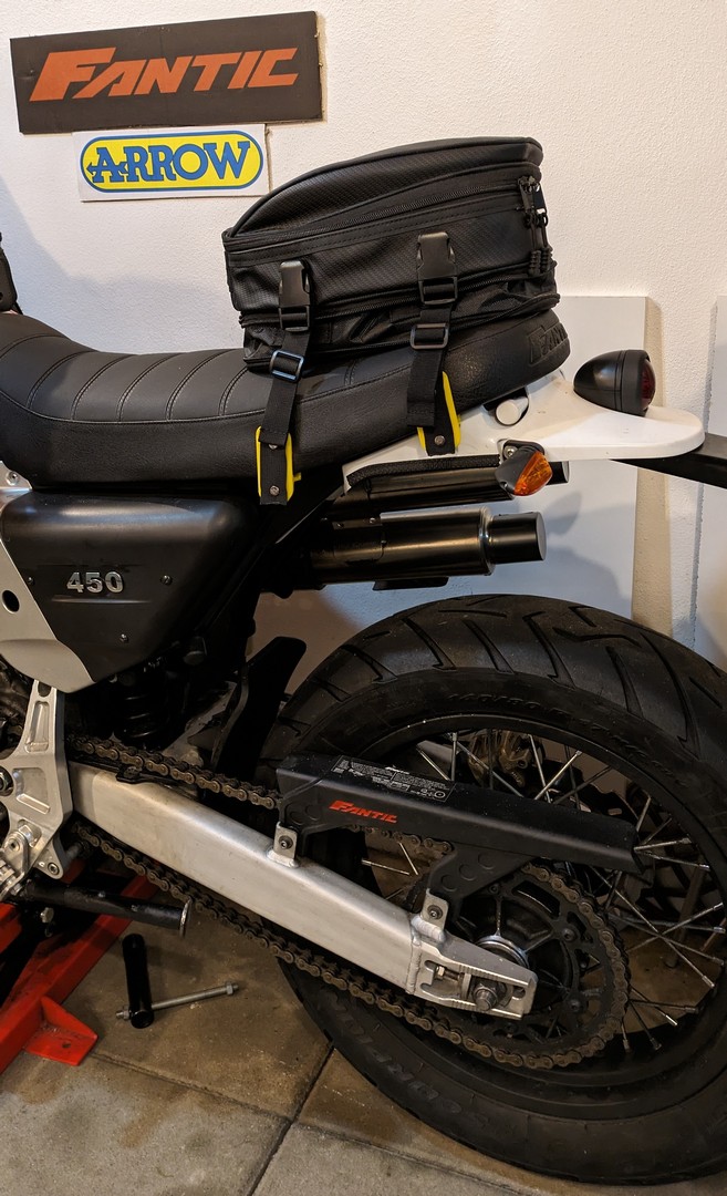 Ich habe die kleine Tanktasche von Fantic. Ist ganz praktisch, das Ding, für den kleinen Ausritt reicht der Platz. Aber mich hat immer gestört, dass die verschraubt werden muss und immer auf der Fantic bleibt. Zumal die silberne Tankabdeckung mit den Gummirippen ja auch ganz schick aussieht.