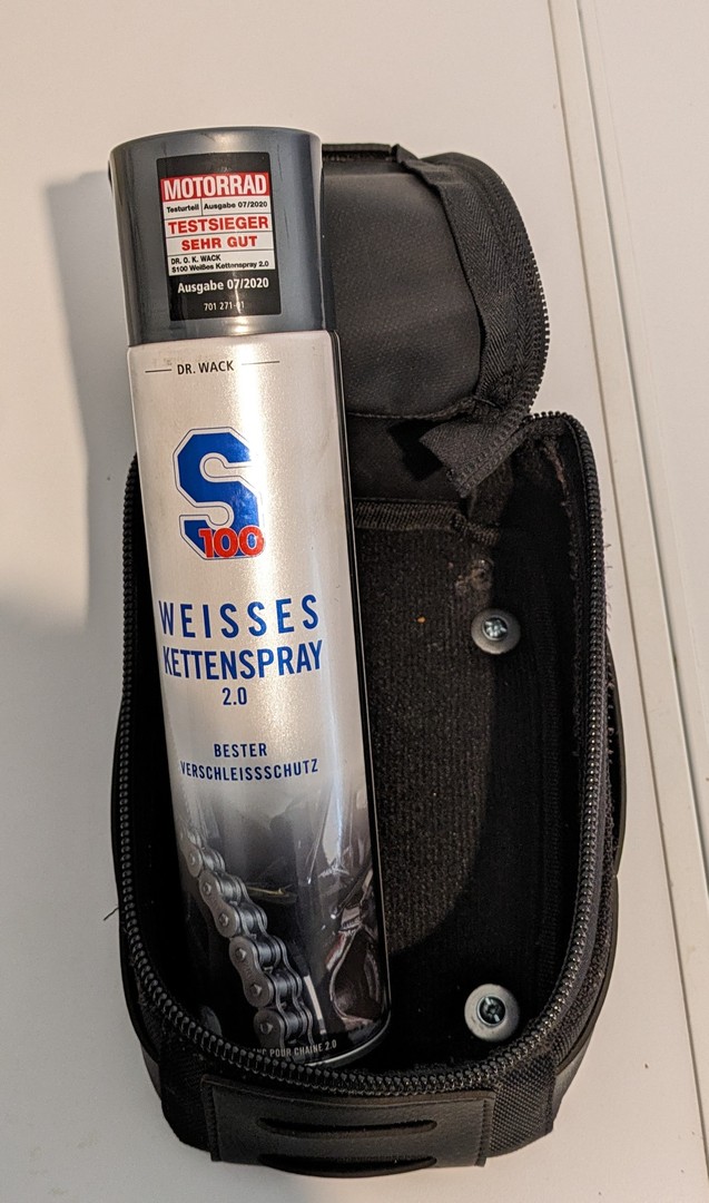 Manchmal muss man ja doch etwas transportieren, sei es nur eine Dose Kettenspray, die man auf dem Rückweg von der Werkstatt noch mitnehmen will. Die passt schon nicht mehr rein in die kleine Tanktasche, die mit gut 20 * 12 * 8 cm Innenmaß doch sehr klein ist. Das sind nicht mal 2 Liter. Und immer auf Verdacht einen Rucksack umschnallen ist ja auch blöd.