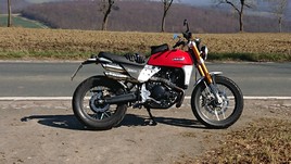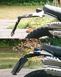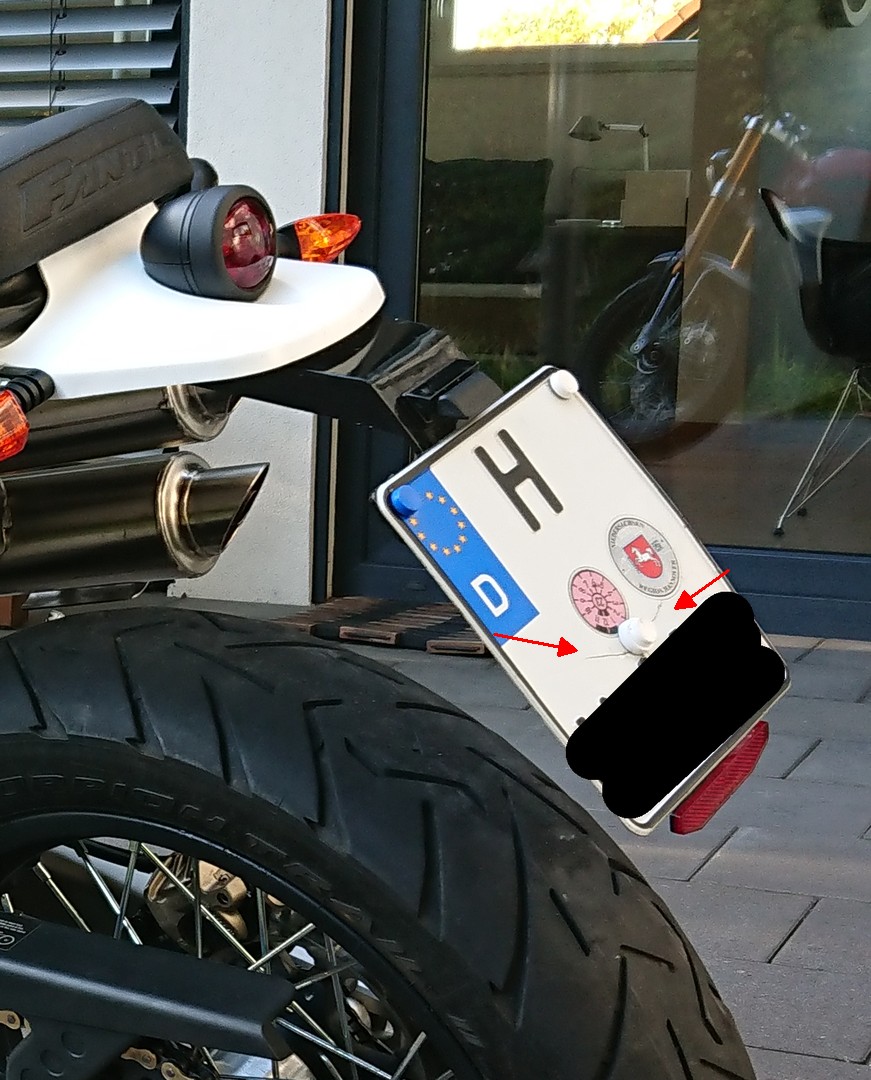 Der lang nach hinten ausladende Kennzeichenhalter war das erste, was mir an der Scrambler nicht gefiel. Der hat die Proportionen gestört. Ich habe mir aus 4 mm starkem Alu Blech einen Halter zurechtgesägt und gebogen. Als Rückstrahler habe ich ein Teil von Louis genomen. Die Kennzeichenleuchte habe ich bei Amazon bestellt. Ist baugleich wie das Originalteil, nur ohne Fantic Schriftzug. Da der Einzylinder sehr stark vibriert habe ich noch seitliche Bleche anschweißen lassen, damit der Halter nicht durch Schwingungen zerstört wird. Gefällt mir viel besser und ist auch leichter als das Originalteil. Schleifen tut nichts und die gesetzlichen Vorgaben werden auch (fast) eingehalten: "Das Kennzeichen kann leicht geneigt montiert werden, wobei der Winkel 30 Grad von der Senkrechten nicht übersteigen darf. Es muss also zwischen 60 und 90 Grad zum Boden stehen. Weiterhin müssen folgende Abstände zum Boden eingehalten werden: Unterkante: mindestens 30 cm über dem Boden."