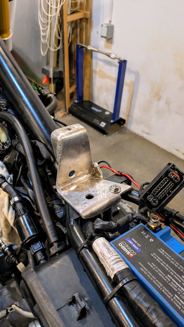 Zum Abbauen der ABS Steuereinheit musste ich natürlich alle Bremsleitungen lösen und dann die Einheit samt Halterung für den Tank abbauen. Erst dann kam ich an die zweite Schraube auf der Unterseite. Dann hatte ich wieder eine Halterung in der Hand, die ich für zu schwer befand. Fast ein halbes Pfund. Das geht auch leichter in Alu. Das habe ich mal schnell gemacht, bevor die ABS Steuereinheit und alle Bremsleitungen wieder dran sind. Dann komme ich da nicht mehr ran. 4 mm Alu Blech war noch da, schnell ausgesägt, zurechtgebogen und die 3 Schweißnähte wieder im gleichen Fachbetrieb im Nachbardorf schweißen lassen.