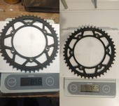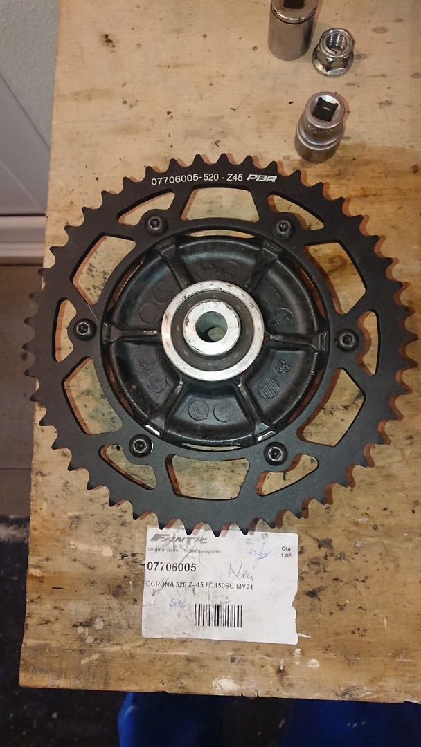 Ich habe das Teil nun innen anstatt außen an die Halterungen geschraubt. Dazwischen noch zwei Distanzstücke aus einer 16 mm Alu-Rundstange gesetzt. Die habe ich mit 4er Bohrer durchgebohrt und M5 Gewinde reingedreht. Die Schraube von innen mit Schraubensicherung fixiert, so dass sich nur die Schraube von außen losdreht, wenn man das Teil mal abbauen muss. Jetzt sitzt er richtig. ![]() ![]() ![]() Kette DID520VX3(G&B) 110 endlos, Ritzel 14 Zähne, Kettenrad 45 Zähne neu (25.07.2022)