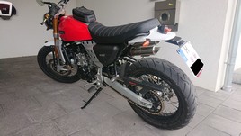 Vorne hatte ich ja bereits seit September 2020 ein 14er Ritzel drauf, weil mir die Caballero für die Straße etwas zu kurz übersetzt schien. Außerdem passt mit der dickeren Aluschwinge kein 13er Ritzel, da würde die Kette auf der Schwinge schleifen. Das habe ich aber auch erneuert. Das hintere Kettenrad habe ich auch noch mal 3 Zähne kleiner genommen. Bei den neuen MY21 Caballero Modellen sind die Übersetzungen im Getriebe anscheinend geändert. Die haben jetzt noch mal kleinere Kettenräder. Da gibt es nun auch ein 45er Kettenrad, das habe ich mir bestellt. Da die Aufnahme am Hinterrad nicht geändert wurde, passt das problemlos. 110 Glieder musste die Kette trotzdem haben. Bei der Aluschwinge fangen die Schlitze für die Hinterradverstellung etwas weiter hinten an. Da hatte es mit der alten Kette und dem 48er Kettenrad so gerade eben gepasst. Fährt jetzt mit 4.800 Umdrehungen im 6. Gang 100 km/h, schöne Geschwindigkeit bei schöner Drehzahl. Die im Fahrzeugschein angegebene Höchstgeschwindigkeit von 139 km/h wird immmer noch locker erreicht. Und das kleinere Kettenrad ist noch mal 94 Gramm leichter. Die Ketten habe ich nicht gewogen, die Alte war zu dreckig. Außerdem wird das wohl gleich sein. ![]() ![]() ![]() ![]() Rechnung Kette Rechnung Ritzel,Kettenrad Besonders praktisch für den Wechsel der Kette ist die Konstruktion der Schwingenaufnahme und der Fußrastenträger. Wenn man den linken Fußrastenträger abbaut, kann man problemlos eine vernietete endlos Kette ohne Schloss einbauen. Dazu muss nur die Mutter der Schwingenachse abgenommen werden, die Achse und die Schwinge können eingebaut bleiben. PS: 08.03.2025. Leider hat die goldene Beschichtung nicht lange gehalten. Schon nach einem Jahr waren die Laschen nicht mehr golden, sondern silbern. Nur Reste der Goldbeschichtung waren zu erkennen. So sieht es jetzt noch 12.500 Kilometern aus. ![]() Kettenschleifer lose (08.03.2025)