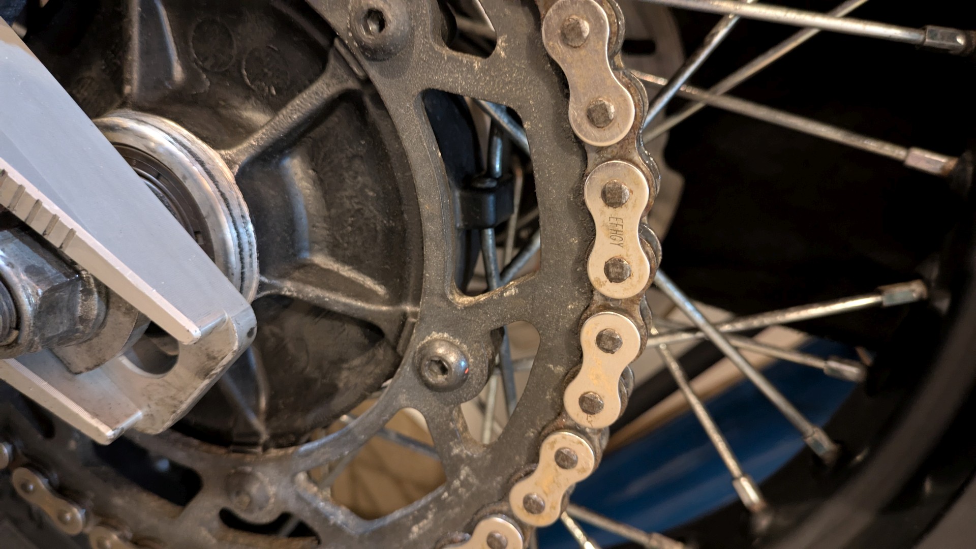 Habe nach etwa 15.000 km Kette und Zahnräder gewechselt. Sah alles eigentlich noch gut aus aber ich wollte ganz gerne eine Kette mit goldenen Laschen. Sieht schicker aus. Ist natürlich eine 520er X-Ring Kette. Historisch bedingt werden die Maße für Motorradketten noch in englischem Zoll angegeben. Die Caballero braucht eine Kette mit einem Abstand von Bolzenmitte zu Bolzenmitte von 5/8 Zoll und einer Kettenbreite innen von 1/4 Zoll. Die Rollenstärke ist 2/5 Zoll. Warum diese Ketten die Handelsbezeichnung "520" bekommen haben?