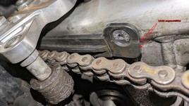 Bei der letzten Putz- und Wartungsaktion ist mir aufgefallen, dass der Kettenschleifer, der die Alu-Schwinge schützt, auf der Unterseite lose war. Er lag aber nur leicht auf der Kette auf und war nur minimal abgeschliffen. Die Schraube hatte sich verflüchtig. Ich habe die damals beim Umbau auf die Alu-Schwinge wohl nicht fest genug gedreht. Schraubensicherung habe ich auch nicht benutzt. Jetzt habe ich eine normale Senkkopfschraube M8x20 mm genommen und mit mittelfester Schraubensicherung mit 22 Nm festgezogen. Damals habe ich die nicht so festgezogen, weil ich dachte der Schleifer aus Kunststoff mag das nicht.