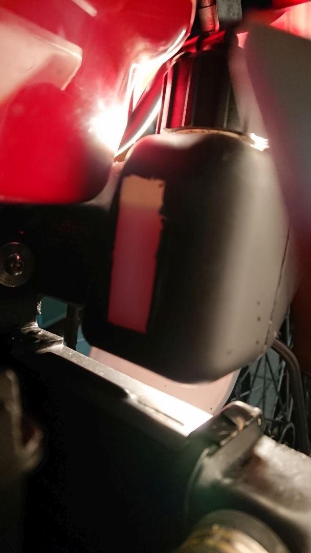 Der Ausgleichsbehälter für die Kühlflüssigkeit hat mir von Anfang an nicht gefallen. Weil er zwecks Füllstandkontrolle leicht transparent ist, färbt sich der eigentlich weiße Behälter schweinchenrosa. Die rote Kühlerflüssigkeit scheint so stark durch. Passt überhaupt nicht, finde ich. Ich habe den Behälter abgebaut, mit Silikon-Entferner gereinigt und mit Sprühfolie, die eigentlich für Autofelgen ist, schwarz foliert. Wenn die Sprühfolie die Belastung an Felgen aushält, dann wird es dort auch halten. Zur Füllstandkontrolle habe ich rechts auf der Rückseite einen kleinen Streifen nicht foliert.