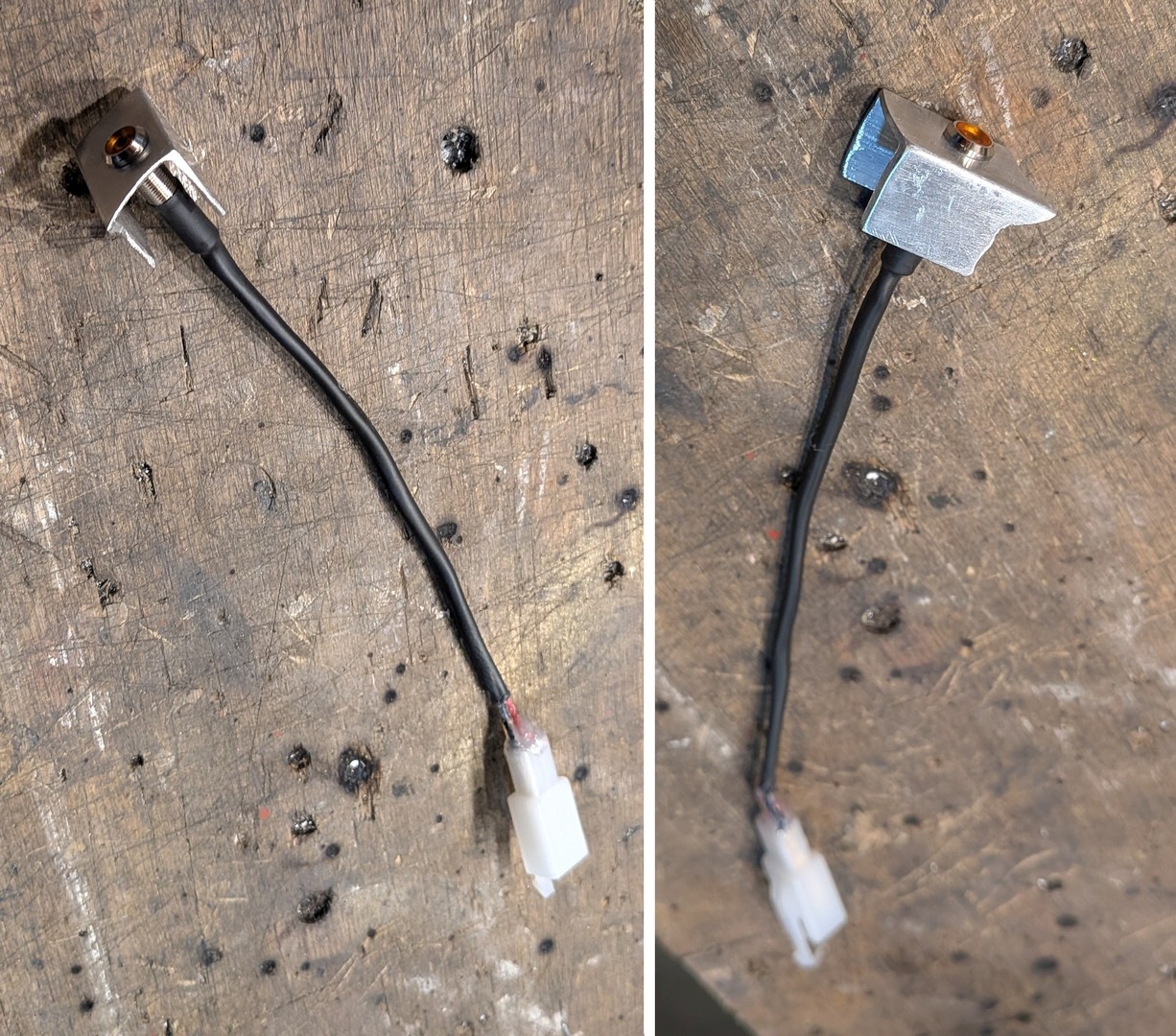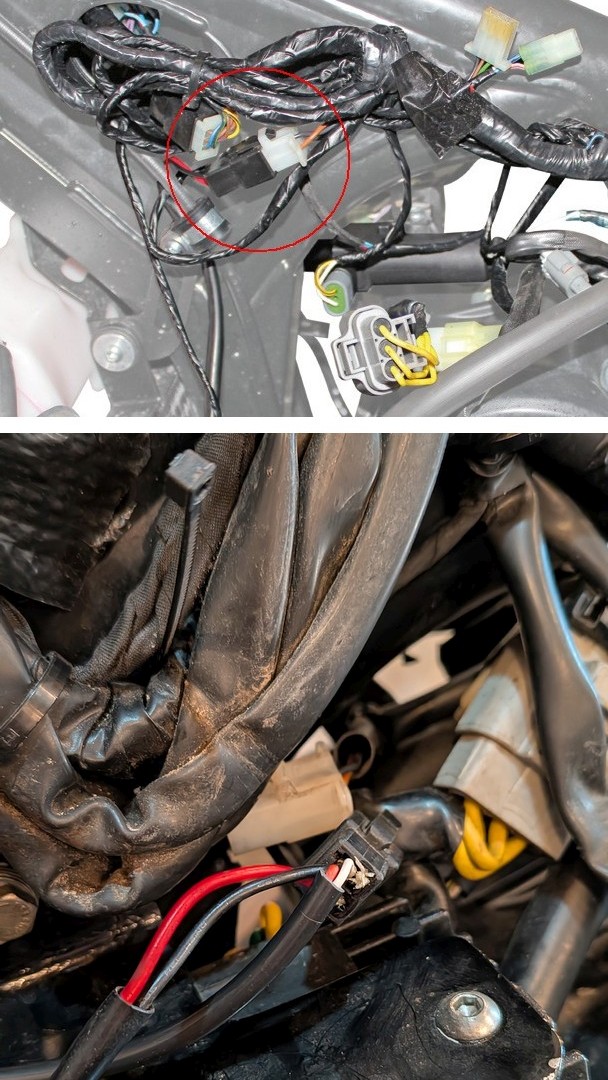 Ich habe bei meiner Caballero noch nicht bemerkt, wann der anspringt. Während der Fahrt würde ich das eh nicht merken aber auch im Stand ist mir das noch nie aufgefallen. Eine Kontrollleuchte wäre nicht schlecht, dachte ich, als ich da im Stau stand. Heute habe ich eine kleine LED Kontrollleuchte mit einem selbstgebauten Halter aus einem Stück U-Profil angebaut. Den habe ich rechts an die Ganganzeige mit dem gleichen doppelseitigem Klebeband angeklebt, mit dem die an der Gabelbrücke angeklebt ist. Das hat bisher gut gehalten und lässt sich bei Bedarf auch einfach lösen und neu ankleben. Beim Anschließen der LED auf die richtige Polung achten. Anders als bei Glühbirnen funktionieren LEDs nur, wenn Plus auch mit Plus verbunden ist. An der Kontrollleuchte und am Lüfter ist das rote Kabel Plus. Angeschlossen habe ich die LED direkt am Stecker des Lüfters, wieder "quick and dirty" wie schon beim USB Ladeanschluss: Die Enden der beiden Kabel mit etwas Lötzinn versteift, hinten in die beiden Anschlüsse des Lüfters reingesteckt, Streichholz dazu geschoben und einen Tropfen Superkleber drauf. Das hält dort nun schon ein paar Jahre.