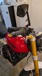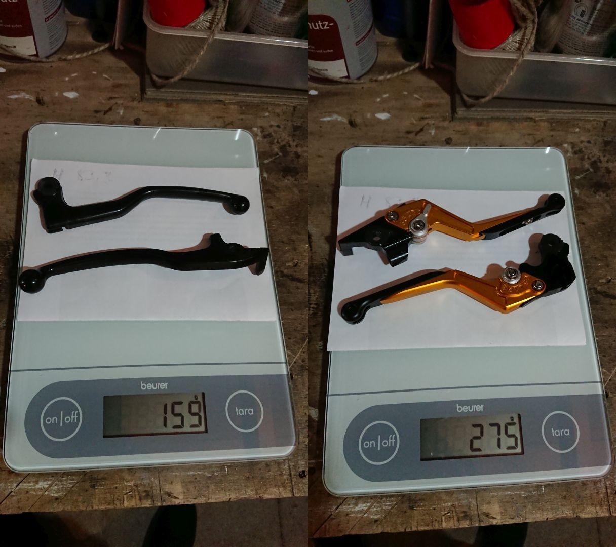 Die Lenkergewichte sollen ja eigentlich als zusätzliche Masse am Lenker Vibrationen und Schwingungen dämpfen. Die Originalteile sind auch echte Schwergewichte verglichen mit diesen leichten Alu-Teilen. Ein halbes Pfund leichter. Ich habe aber keinen Unterschied bemerkt. Bisher hatte ich keine Probleme mit Vibrationen oder Lenkerflattern. Und die glaslosen mo.view race Rückspiegel haben auch keine Probleme mit Vibrationen. ![]() ![]() Schick sehen sie auf jeden Fall aus. Und die Halterung ist auch viel stabiler als die Plastikhülse an den Originalteilen. An die Wand in der Werkstatt habe ich jetzt eine Gummimatte geklebt, damit die nicht wieder verkratzen. |