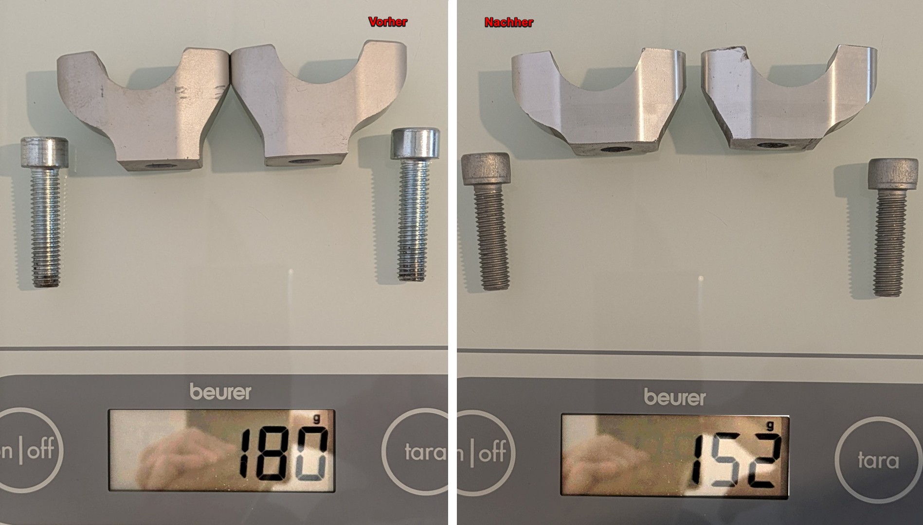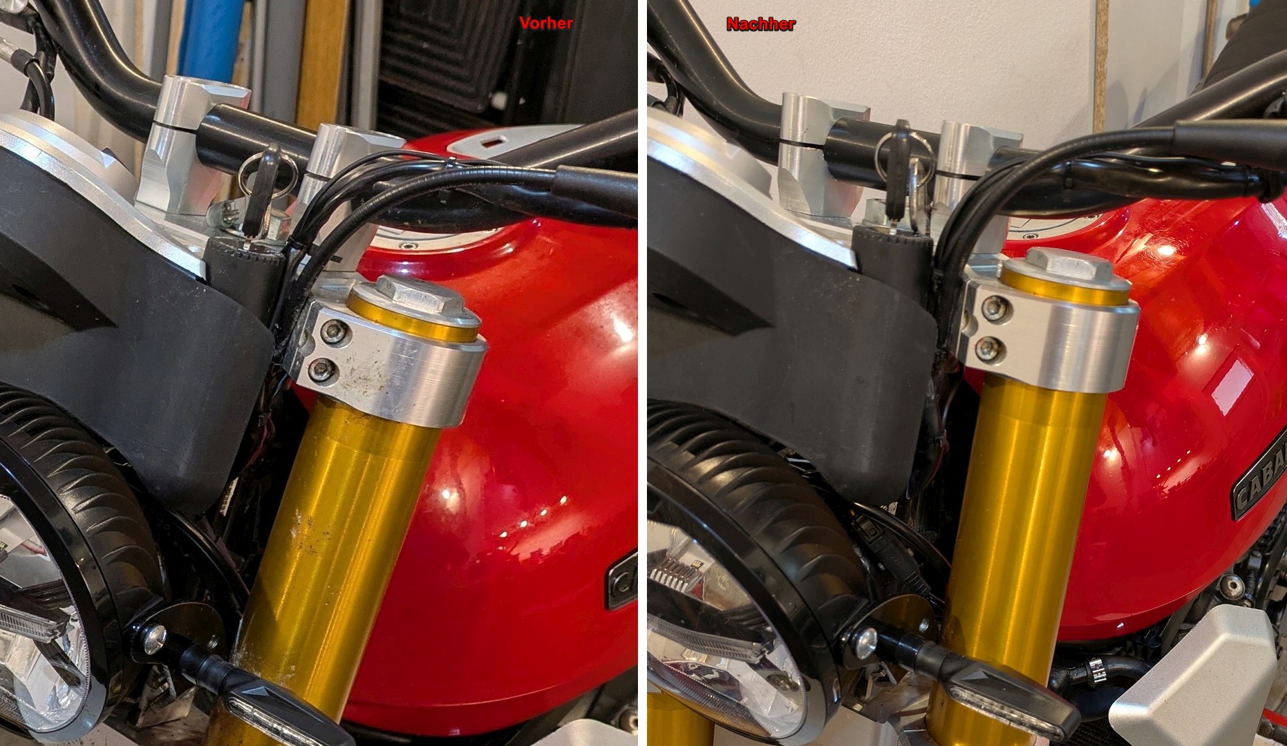 Beim Wechseln der Griffe habe ich nicht nur die Breite des Lenkers unter die Lupe genommen. Auch die Höhe war auf einmal ein Thema. Die sorgt für eine aufrechte Sitzposition, die eher geländetauglich ist. Ich hätte lieber eine leicht gegen den Fahrtwind gebeugte Sitzposition, das passt besser zur Landstraße. Deswegen habe ich mir die unteren Lenkerhalter angeschaut. Unter der Bohrung für die beiden M10 Schrauben war noch 12 mm Material. Da hatte ich keine Bedenken, die Halter um 7 mm zu kürzen. Jetzt ist da noch 5 mm Alu vorhanden. Das ist stabil genug. Neue 5 mm kürzere Schrauben habe ich auch genommen. Die Alten ragten nun unter der Gabelbrücke sehr weit heraus. Sah nicht gut aus.