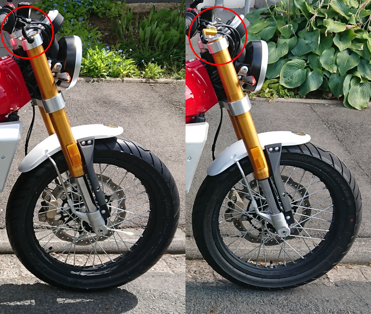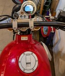 ![]() ![]() ![]() Die Sitzposition gefällt mir so besser. Und der Blick auf die Ganganzeige ist nun auch frei. Vorher musste ich mich immer etwas nach vorne beugen, um zu erkennen, ob eine 5 oder 6 angezeigt wird. Der rechte obere Lenkerhalter hatten das immer etwas verdeckt. Gewichte an den Lenkerenden getauscht (15.05.2025)