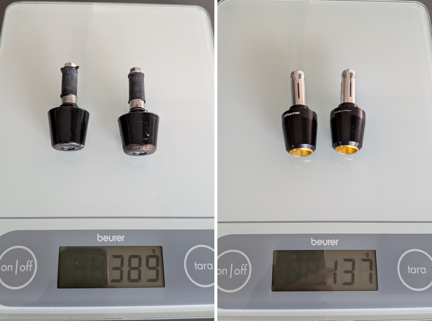 Die Lenkerenden an meiner Caballero waren schon ganz schön in Mitleidenschaft gezogen. Rechts schramme ich damit immer an der Wand, wenn ich die Maschine abstelle. Und links war sie mir gleich zu Anfang auf die Seite gefallen, als ich beim Anfahren wenden wollte und der Motor schlagartig abstarb. Als ich mal wieder auf die Fantic Seite schaute, entdeckte ich als Fantic Originalzubehör die schicken Lenkerend-Caps. Sind leider etwas teuer aber dafür steht "Fantic" und "Made in Italy" drauf.