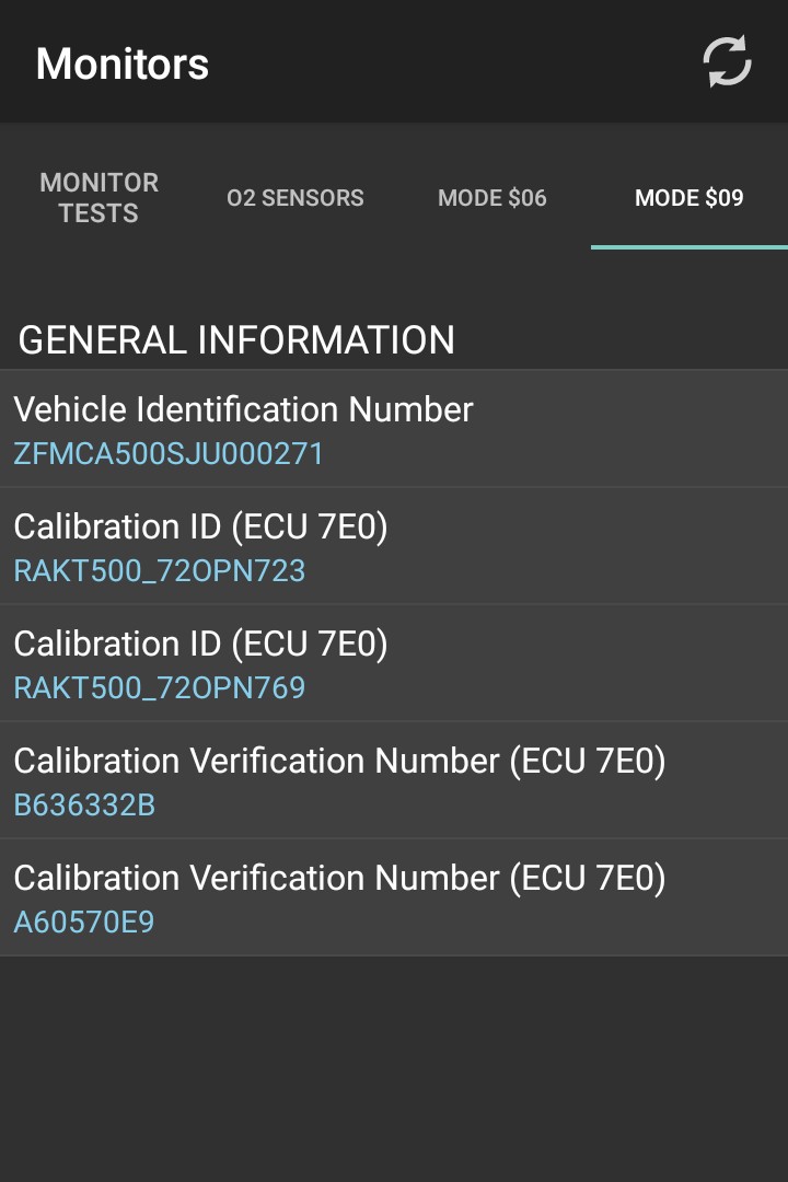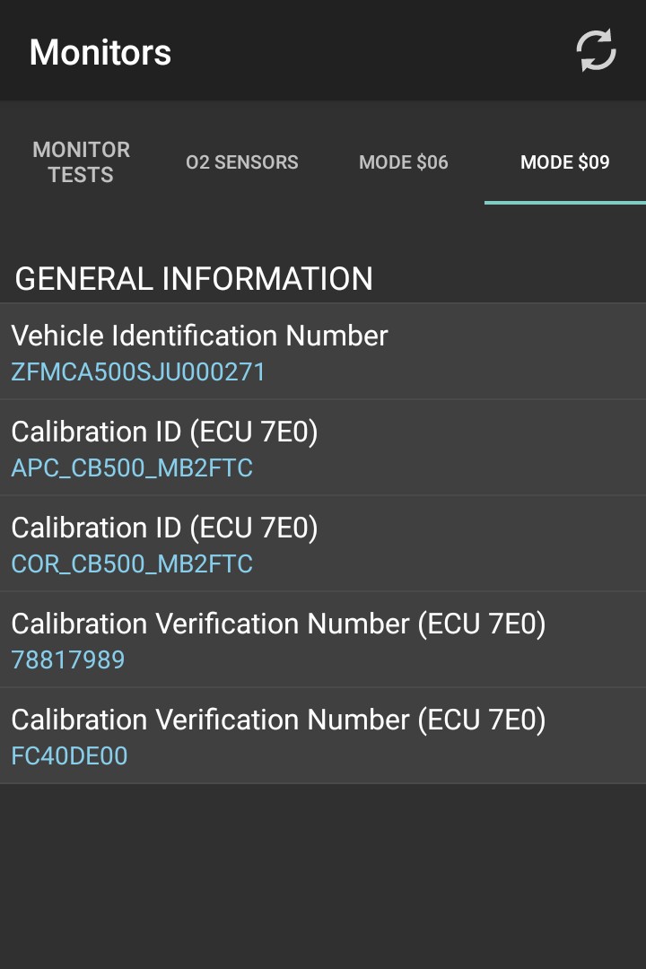 Im September 2020 gab es im Zusammenhang mit einem Rückruf noch mal ein geändertes Mapping von Fantic, dass meine Maschine aber erst im April 2021 bekam, als die Kurbelwellenlager geplatzt waren. Mit der App für den OBDLink LX kann man unter der Funktion "Monitors" die Seite "Mode $09" aufrufen. Da werden die "Calibration IDs" des Mappings angezeigt. So sehen die Werte für das aktuelle Mapping einer Euro 4 Maschine nach dem Rückruf Kühler/Thermostat aus: