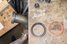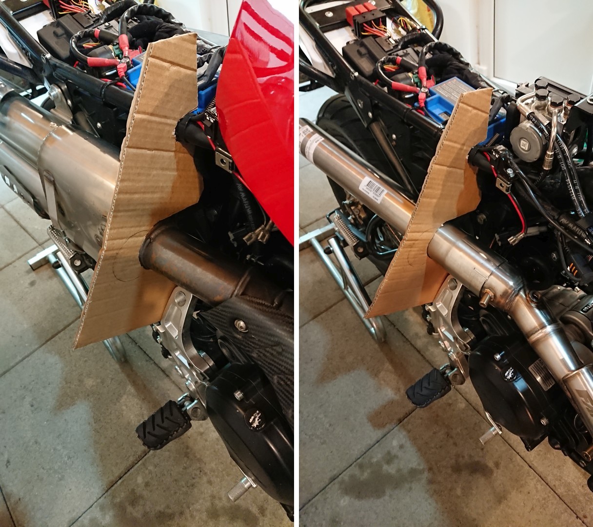 Schon seit einigen Wochen habe ich das Gefühl, dass der Krümmer nicht mehr dicht ist. Irgendwie klingt es danach. Heute habe ich den Auspuff abgebaut und mal geschaut. Eine neue Dichtung hatte ich schon vor ein paar Tagen besorgt. Und tatsächlich, am Krümmer und an der alten Dichtung ist deutlich zu erkennen, dass da Verbrennungsgase durchblasen. Es scheint so, als ob der Flansch etwas verkantet gesessen hat. Beim Festziehen mit der neuen Dichtung habe ich den Auspuff an der hinteren Halterung nur locker abgestützt und gemerkt, dass der etwas Abstand zur Halterung am Rahmen braucht. Mit einer Unterlegscheibe habe ich das ausgeglichen. Getestet habe ich das leider noch nicht. Im Augenblick ist Dauerstarkregen angesagt.