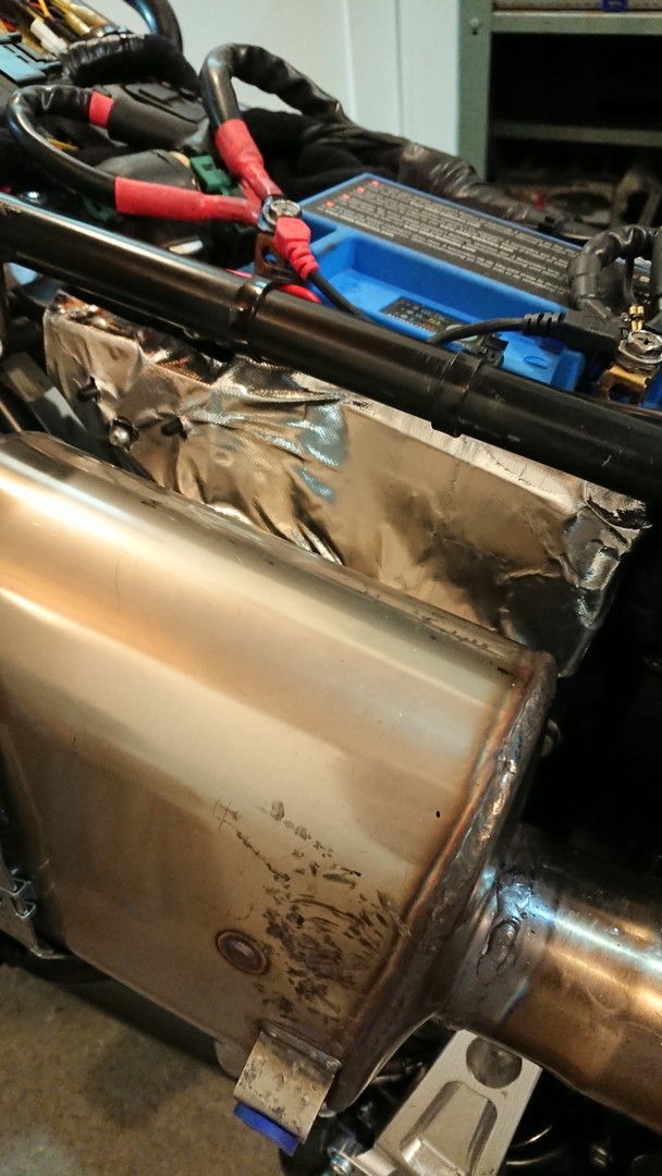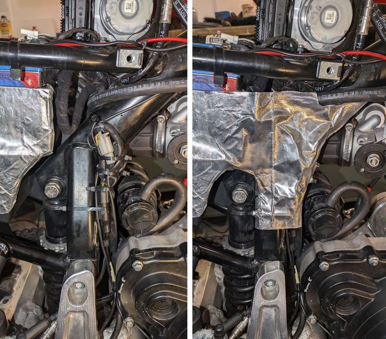 ![]() ![]() Bei der Gelegenheit (Auspuff ab), habe ich noch mal alle Kabel geprüft, die da um den Stecker des hinteren ABS Sensor herum liegen und wie ein Rollbraten verschnürt sind. Die Ursache für diese merkwürdigen Tacho Ausfälle sind ja leider immer noch nicht gefunden, obwohl mittlerweile alles auf das ABS Modul hindeutet. Ich habe alle Kabelbinder gelöst und alles so gut es geht geordnet und neu verzurrt. Irgendwie sahen die Ummantelungen der Kabel durch die Hitze des Auspuffs in Mitleidenschaft gezogen aus. Deswegen habe ich noch etwas Hitzeschutzfolie darüber geklebt, die ich immer noch vom Krümmer Umbau übrighabe. |