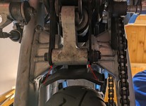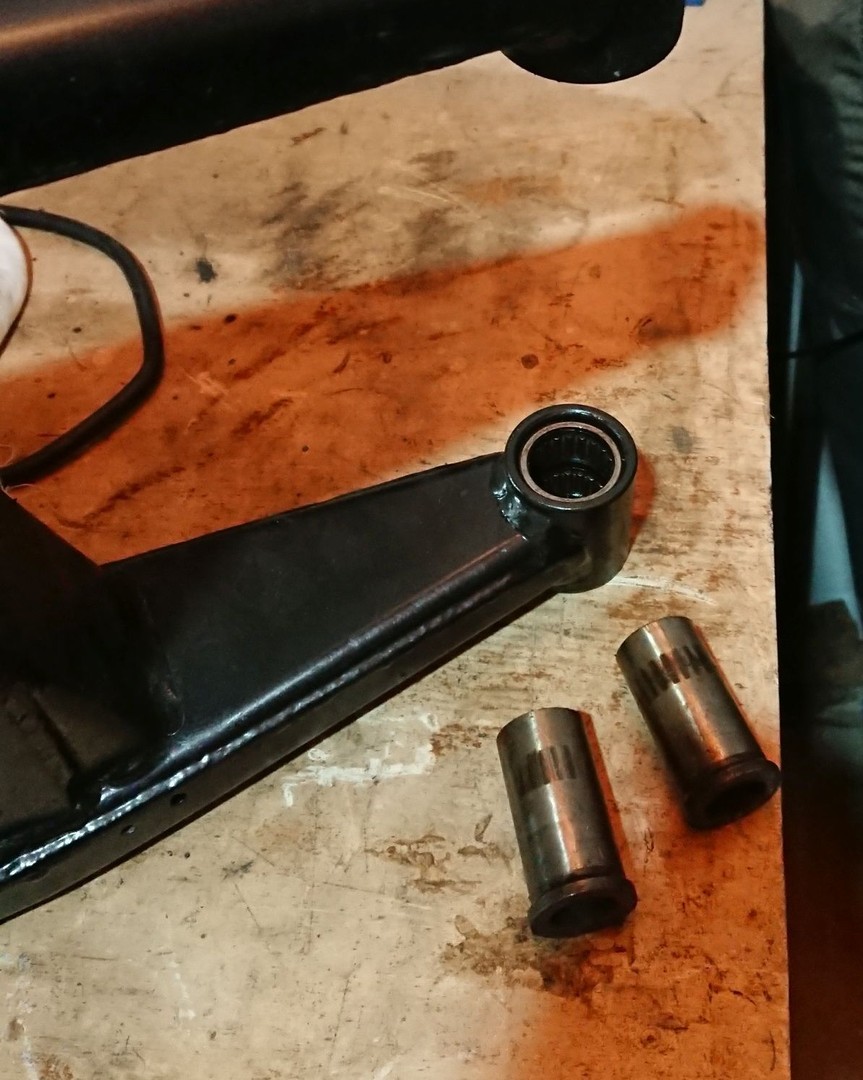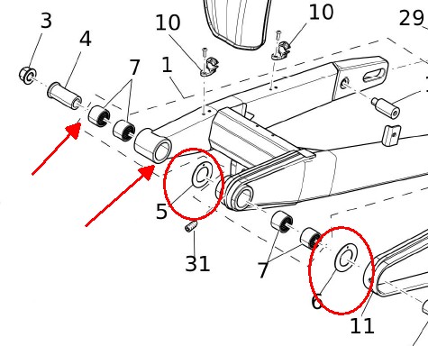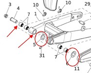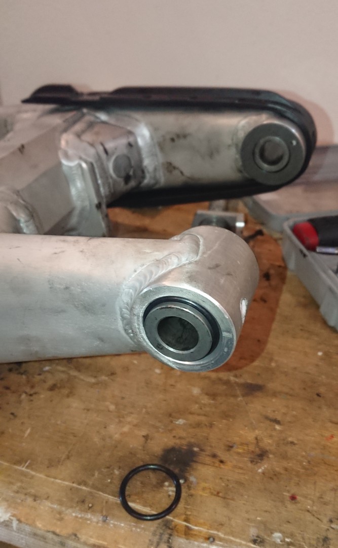 Bei der Gelegenheit habe ich auch "mal schnell" die Schwinge ausgebaut, um zu kontrollieren, wie meine Verbesserungen (O-Ringe und Anlaufscheiben, siehe oben) wirken.