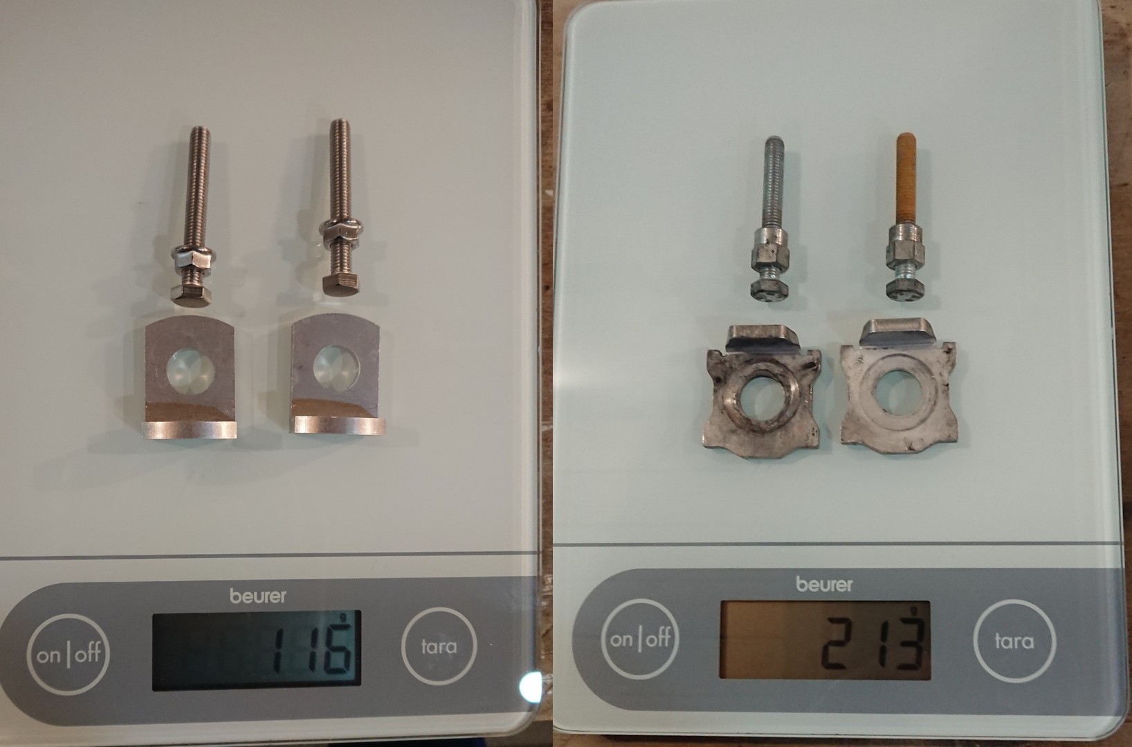 ![]() Dass die Kettenspanner der Stahl-Schwinge nicht passen, wusste ich schon vorher. Da hatte ich bereits bei Berotec die verbesserten Teile bestellt. Sind wirklich super und sehr viel leichter als die Stahl Kettenspanner der Scrambler: ![]() Da alle Maße identisch sind, hat sonst alles gepasst bis auf die Schraube, mit der die Stoßdämpfer-Umlenkung an der Schwinge befestigt wird. Die ist zu kurz, weil die Aufnahmen der Alu-Schwinge dort dicker sind. Die Schraube der Rally ist 14 mm länger. Und den neuen Kettenschleifer samt Halterungen muss man haben. An der Stahl-Schwinge waren da Gewindelöcher, die Alu-Schwinge hat da nur große Löcher für die Befestigung per M8 Alu-Nieten. Die neue Schwinge mit den neuen Kettenspannern ist 3,25 kg leichter. Und natürlich viel hübscher: ![]() ![]() ![]() Dann ist mir beim Einbau aufgefallen, dass die Nadellager der Schwinge auf der rechten Seite keinerlei Abdeckung oder Schutz vor eindringendem Schmutz oder Wasser haben. So sahen die Lagerbuchsen auch aus. Auf der linken Seite bei der Antriebskette sind innen und außen Anlaufscheiben vorhanden, die das Lager ganz gut abdecken. Rechts würden die auch passen. Die beiden Anlaufscheiben (04663005 und 05142005) habe ich auch noch bestellt und auf der rechten Seite eingesetzt. ![]() ![]() Zusätzlich habe ich noch 4 passende O-Ringe besorgt, die ich auf beiden Seiten auf die Lagerbuchsen gesetzt habe. Passt problemlos und sieht nun wirklich dicht aus. Vorher war da ein richtiger Spalt, wo man fast auf die Nadellager schauen konnte. Die O-Ringe und die Anlaufscheiben fehlen übrigens auch bei der Stahlschwinge auf der rechten Seite und würden dort auch passen. ![]() ![]() Ach ja, und noch was: Das 14er Ritzel habe ich ja schon seit fast 2 Jahren drauf. Damit ist nur noch 1 mm Platz zwischen Zähnen und Kettenschleifer aber das originale 13er Ritzel der Scrambler wäre zu klein. Die Kette würde auf der Schwingenachse aufsetzen. Die Alu-Schwinge hat halt doch überall mehr "Fleisch". An der Schwinge schleift zumindest bei der Scrambler nun nichts. Das mag bei der Rally anders sein. Die hat ja wegen anderem Federbein und Umlenkdreieck 5 cm mehr Federweg. Die Schwinge ist praktisch "im Motor" gelagert und damit ist der Schwingendrehpunkt extrem nah an der Ritzelwelle. Komplett ausgefedert liegt die Kette oben so gerade eben auf dem Kettenschleifer. Unten erfolgt keine Berührung, auch nicht bei voller Einfederung. ![]() Ist gut konstruiert. Beim Gas geben entsteht nicht nur beim Kardanantrieb, sondern auch beim Kettenantrieb ein Aufstellmoment. Das wird bei dieser Konstruktion minimiert. Siehe auch hier. Hier noch mal alle benötigten Teile für den Umbau bei einer Scrambler oder FlatTrack (E4 mit 13er Ritzel): Alu-Schwinge 14er Ritzel Kettenschleifer 2 x M8 Alu-Nieten Schraube Stoßdämpfer-Umlenkung M12 L102 Anlaufscheibe D26 TW24M Anlaufscheibe D28 TW24M 5 x O-Ringe 26x3 mm Berotec Kettenspanner Alu Schwingenlager und Umlenkhebel zerlegt und geschmiert (13.02.2024)