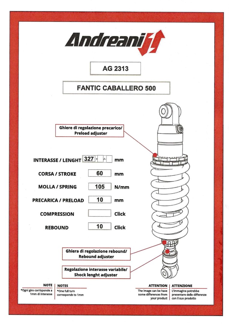 Ich hatte dann auf der Webseite von Andreani auch einen Öhlins Stoßdämpfer für die Scrambler entdeckt und mit dem immer wieder geliebäugelt. Dass der kein externes Ölreservoir hat, finde ich nicht schlimm. Ist dadurch ja auch leichter und bei reinem Straßenbetrieb wird das Öl nicht so stark bewegt und erhitzt sich deswegen nicht so sehr. Es fehlt dann zwar auch die Einstellung für die Druckstufendämpfung (englisch "Compression damping"), ich denke die Standardeinstellung wird beim Öhlins Stoßdämpfer aber auf jeden Fall besser sein als beim Originalen meiner Fantic. Die Einstellung beeinflusst die Einfedergeschwindigkeit des Stoßdämpfers, welche beim Straßenbetrieb eh einen guten Mittelwert aus "nicht zu weich" beim Beschleunigen und "nicht zu hart" bei kurz aufeinander folgenden Bodenwellen abbilden sollte. Jetzt habe ich mir den sozusagen selber zu Weihnachten geschenkt. Ich habe die berüchtigten "Black Friday Weeks" Angebote, die nun überall in den Online Shops aufpoppen, genutzt und den Stoßdämpfer bei Genial Motors in Italien günstig mit 10 % Rabatt und ohne Versandkosten bekommen. Im Bestellprozess musste ich nur mein Gewicht und den Einsatzzweck (Straße/Gelände/Track) angeben, nach 14 Tagen war das Teil da. Die Abbildung auf der Webseite zeigt übrigens nicht das korrekte Teil, die untere Aufnahme des Stoßdämpfers ist falsch. Geliefert wurde aber der richtige Stoßdämpfer, eingestellt mit passenden Werten für mich und meine Scrambler. Auch die Länge war exakt wie das Originalteil. Übrigens merkwürdig, dass da angegeben wird, das Teil würde erst ab Baujahr 2020 passen. Meine Scrambler ist von 2019 und der originale Stoßdämpfer wurde laut Ersatzteillisten nicht geändert (04563005 CABALLERO FC 125-450 SHOCK ABSORBER 2018-2022 "Scrambler E4 + E5").