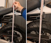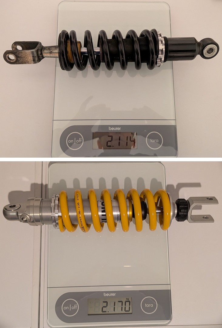 ![]() Erfreulicherweise wiegt das Teil auch nur 56 Gramm mehr als der Originale. Der Einbau war auch nicht schwierig, obwohl der Öhlins Stoßdämpfer etwas dicker ist. Der Auspuff muss zum Umbau aber schon ab, sonst kommt man nicht an die obere Schraube. Der erste Eindruck beim Messen des Negativ-Federweg (englisch "Sag") war schon mal sehr gut. Irgendwie fühlte sich das Belasten und Eintauchen anders an, weicher und besser. Die Einstellungen, die bei "Andreani" vorgenommen wurden, scheinen auch wirklich gut zu passen. Mit mir belastet taucht das Motorrad ca. 5 cm ein, das ist ungefähr ein Drittel des gesamten Federwegs. Der Öhlins Stoßdämpfer scheint mit 60 mm Hub (englisch "Stroke") auch mehr Federweg zu bieten. Beim Original sind es grob geschätzt nur 50 mm, die durch die Umlenkhebel dann 15 cm Federweg ergeben.