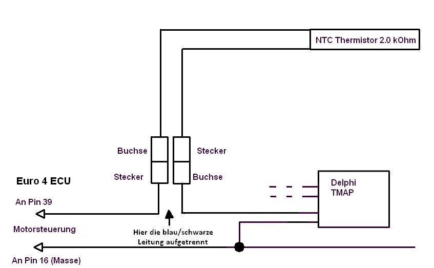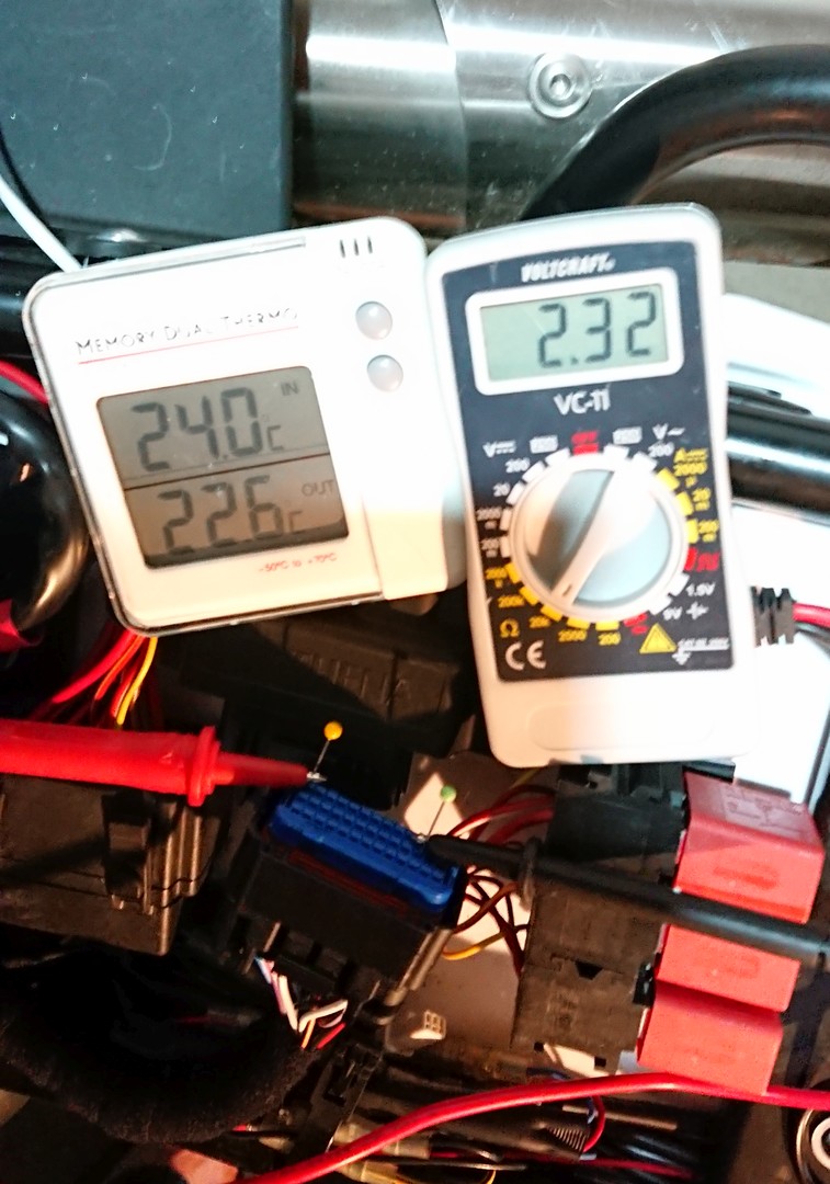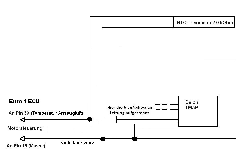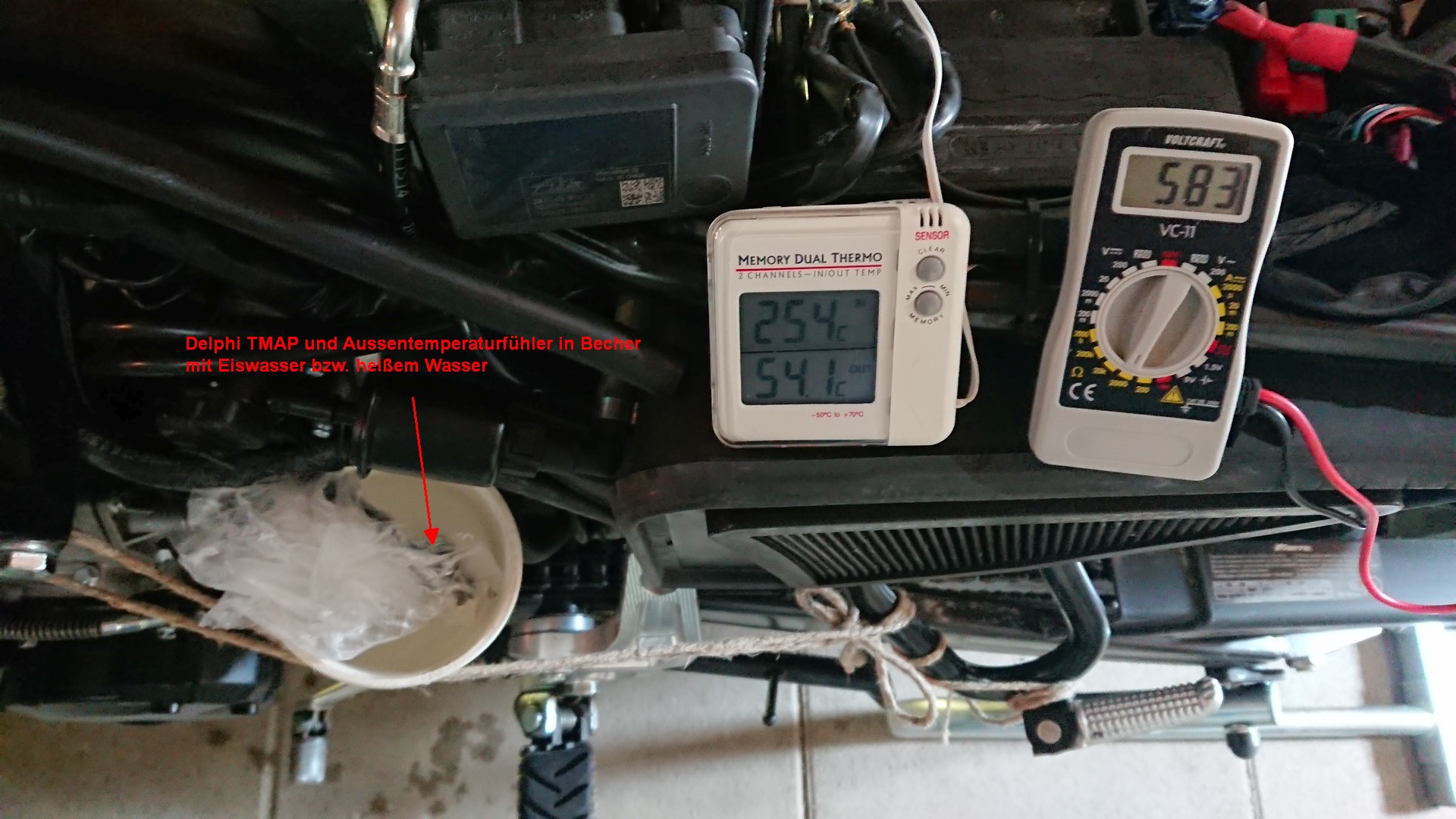Als Vorbereitung auf die HU im Juli habe ich eine AU machen lassen und festgestellt, dass der CO Wert zu hoch ist. Die Änderungen an der Temperaturmessung der Ansaugluft waren sinnvoll für das originale "Schiebe-Ruckeln Mapping" und machten da auch keine Probleme bei HU/AU. Ich habe jetzt aber das Race Mapping drauf. Damit ist ein externer Temperaturfühler, der die echte Außentemperaur an die ECU meldet, eher negativ. Ich habe nun wieder den originalen Temperaturfühler für die Ansaugluft im Delphi TMAP Sensor verbunden, anstatt den externen 2 kΩ NTC. Damit läuft die Maschine besser. Hätte ich eigentlich gleich dran denken sollen, als ich das Race Mapping aufspielen ließ. Erst mal testen ohne die Modifikation, die ja nur für das originale "Schiebe-Ruckeln Mapping" gedacht war. Damit lief die Maschine nun zu fett und der CO Wert war deswegen zu hoch.