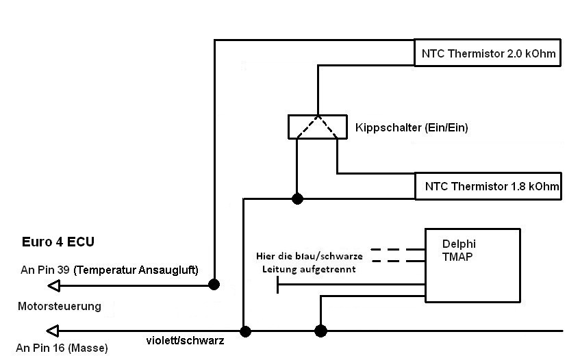 Habe den Schalter seitdem nicht mehr benutzt und den zusammen mit dem zweiten NTC nun abgebaut. Die Maschine läuft am besten, wenn die korrekte Temperatur der Ansaugluft an die Motorsteuerung gemeldet wird.