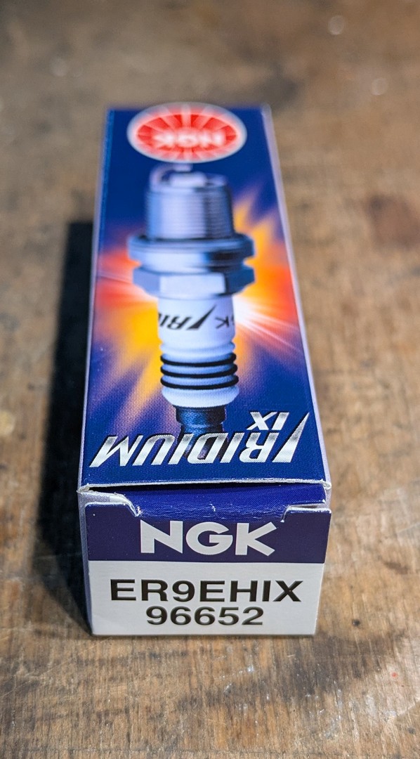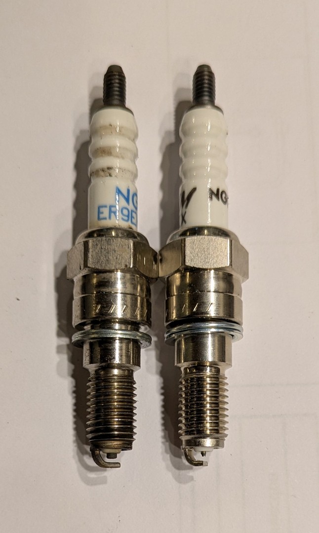 Auf der Suche nach möglichen Gründen für den schlechten Motorlauf im Teillast Bereich, bin ich auch auf den Tipp gestoßen, mal die Zündkerze zu kontrollieren. Laut Handbuch soll da eine NGK Zündkerze drin sein. Als ich nachsah musste ich feststellen, dass bei mir eine chinesische "Torch" Zündkerze verbaut war. Die habe ich erst mal gewechselt gegen einen NGK ER9EH-6N (E = 8 mm Gewinde, R = mit Widerstand, 9 = Wärmegrad (kälter), EH = 19 mm Gewinde nur halb, 6N = Elektrodenabstand 0,6 mm). Hat aber am Problem nichts geändert.